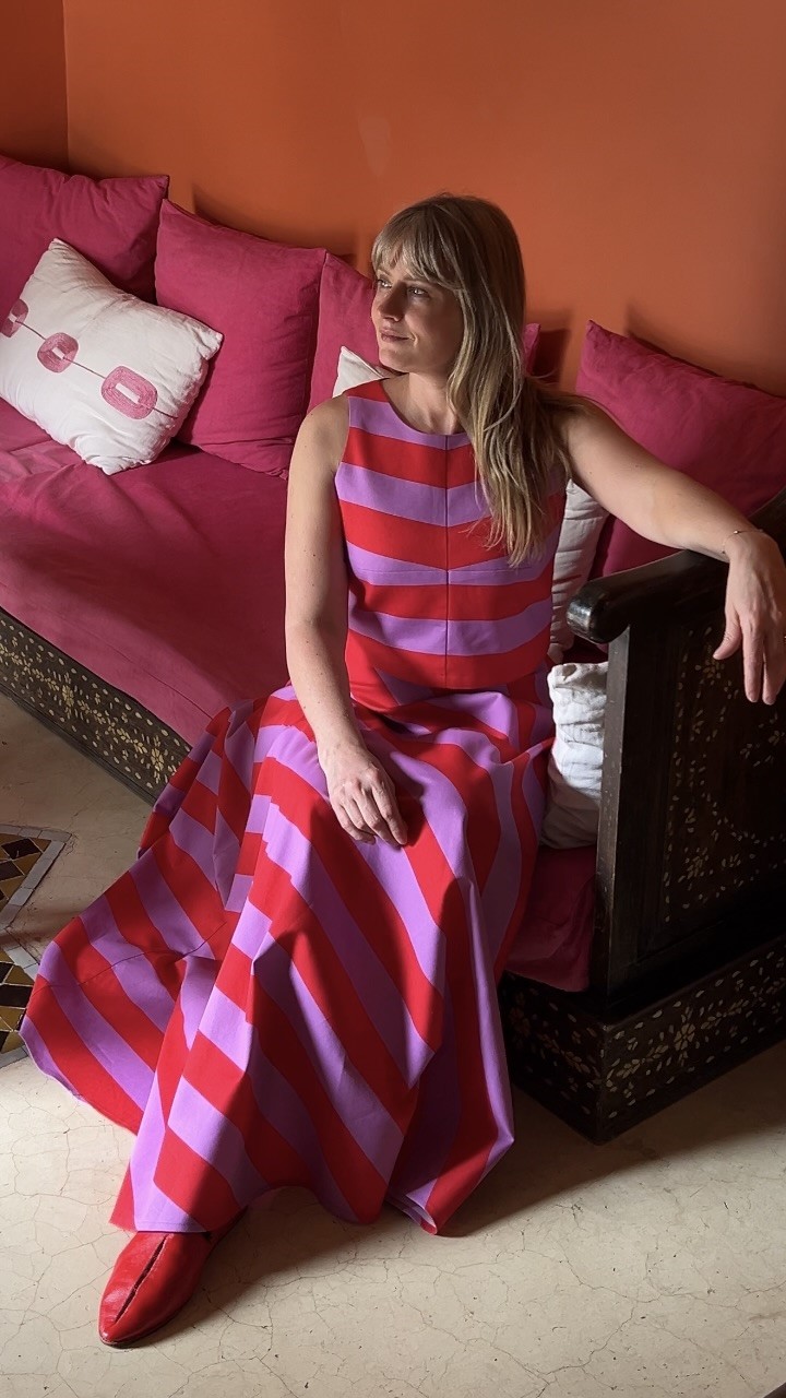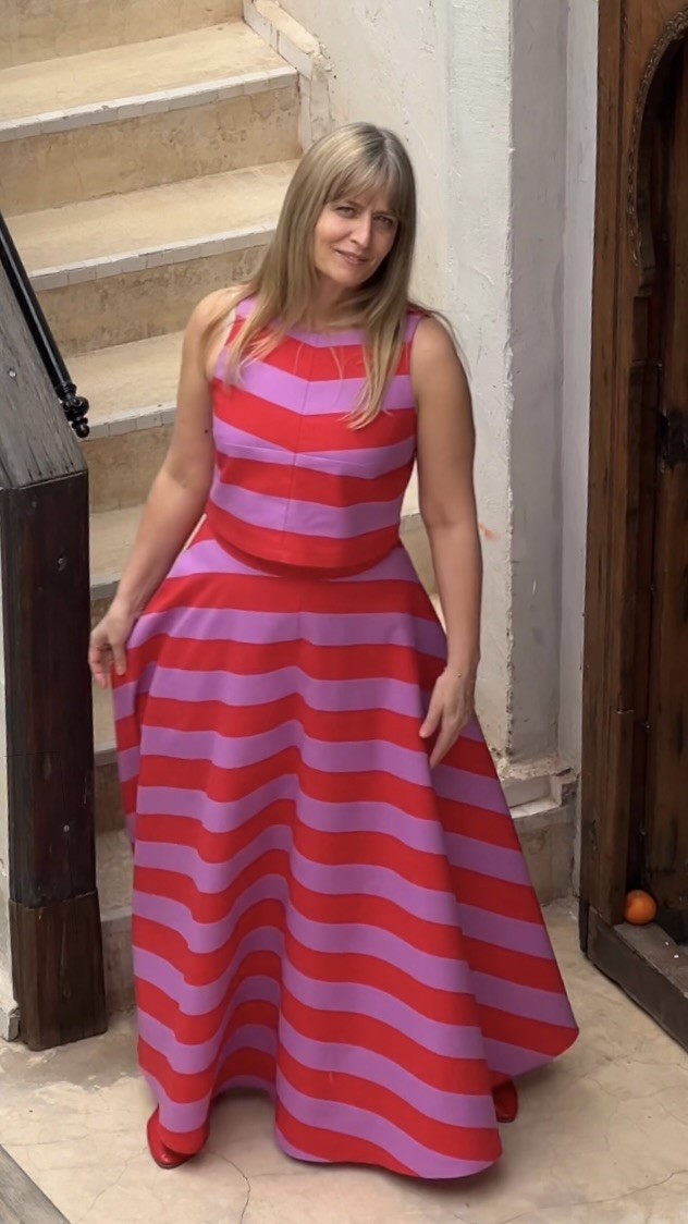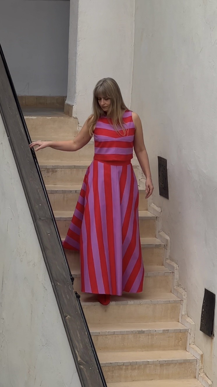 Fason z pół koła sprawia, że spódnica pięknie rozszerza się ku dołowi, dodając sylwetce lekkości i elegancji. Szerokie pasy w mocnych kolorach podkreślają jej unikatowy styl i nadają całości nowoczesnego, a zarazem ponadczasowego wyglądu.