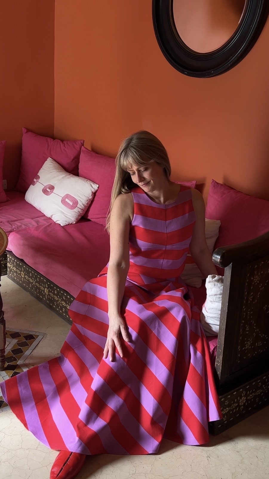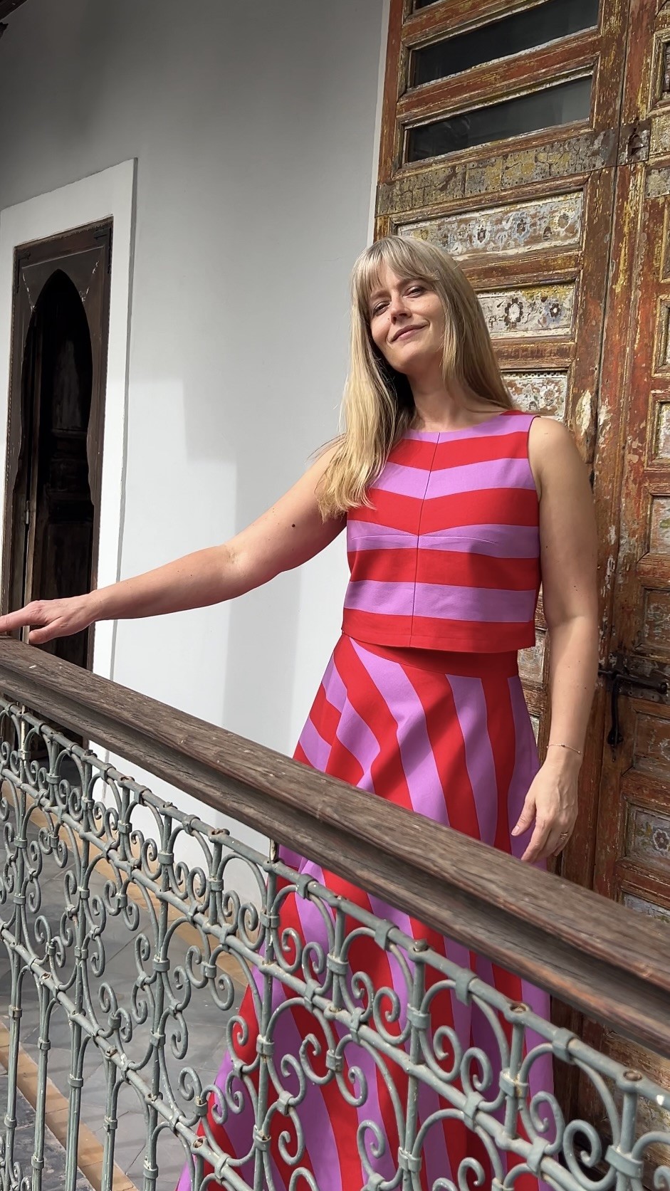 szerokie czerwono- fioletowe pasy – wyrazisty, elegancki design