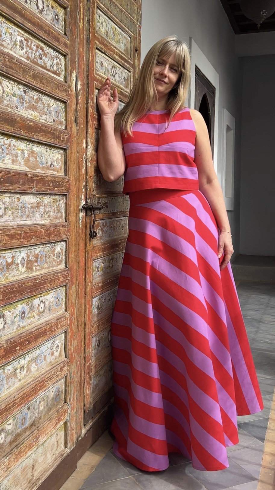 Spektakularna długa spódnica w pasy czerwono- fioletowe.