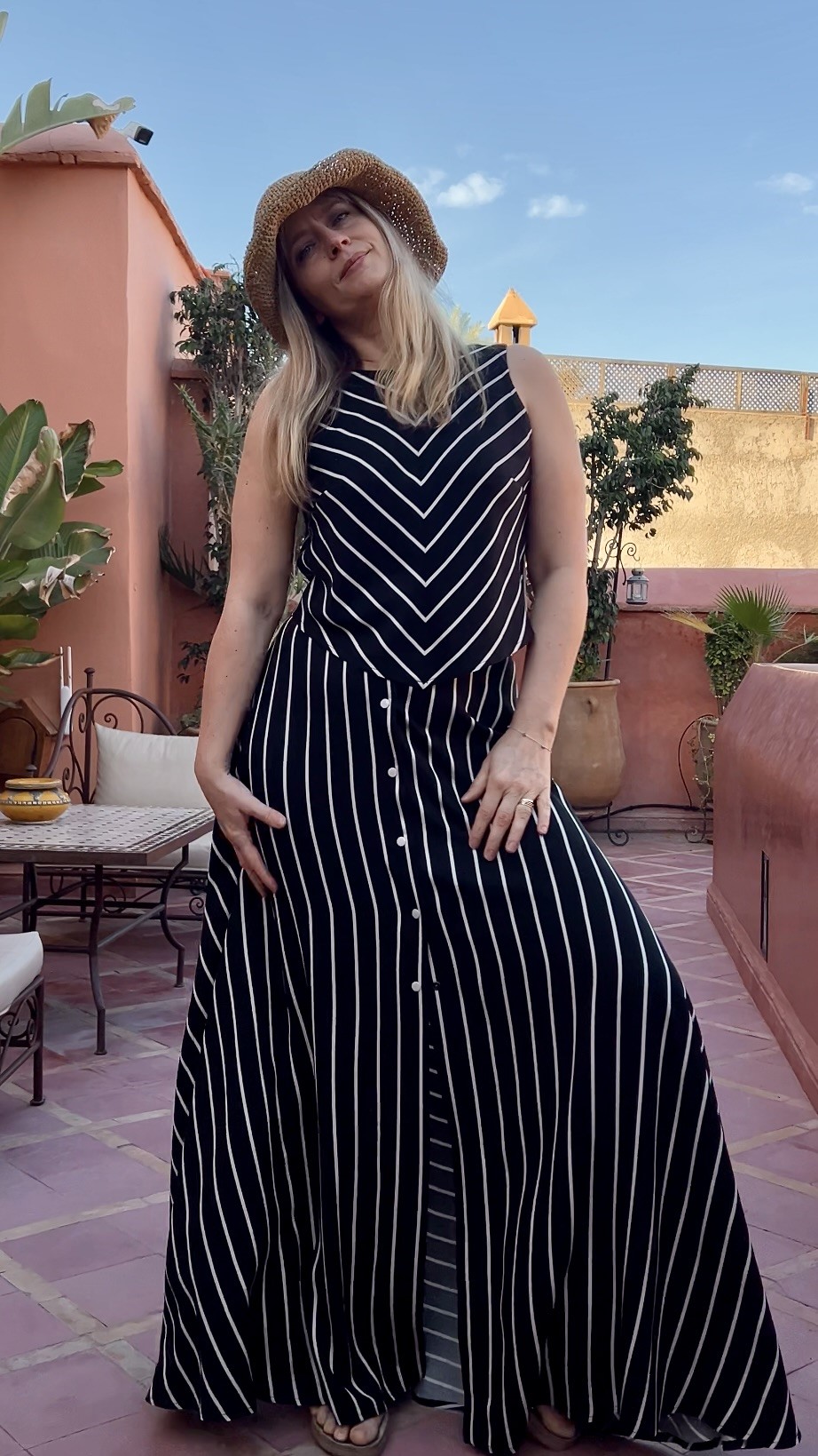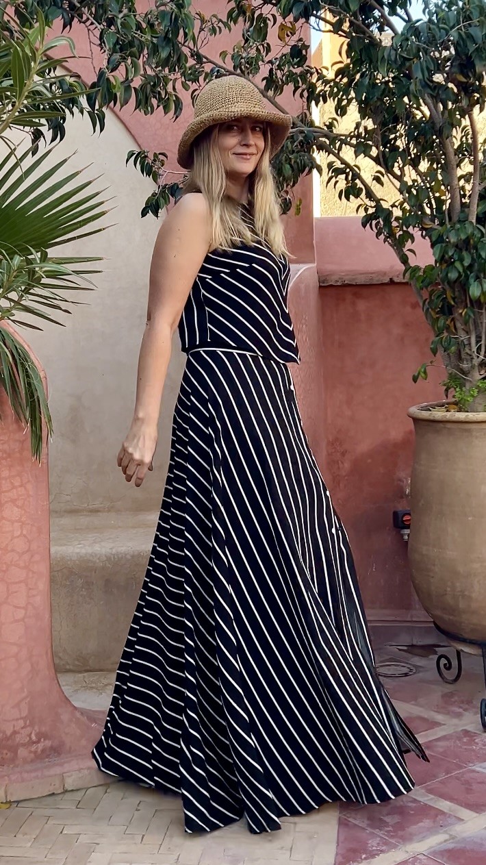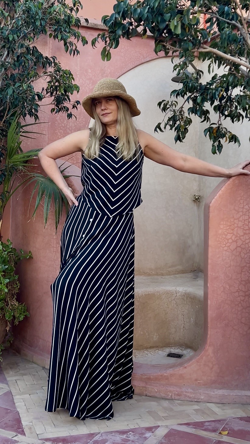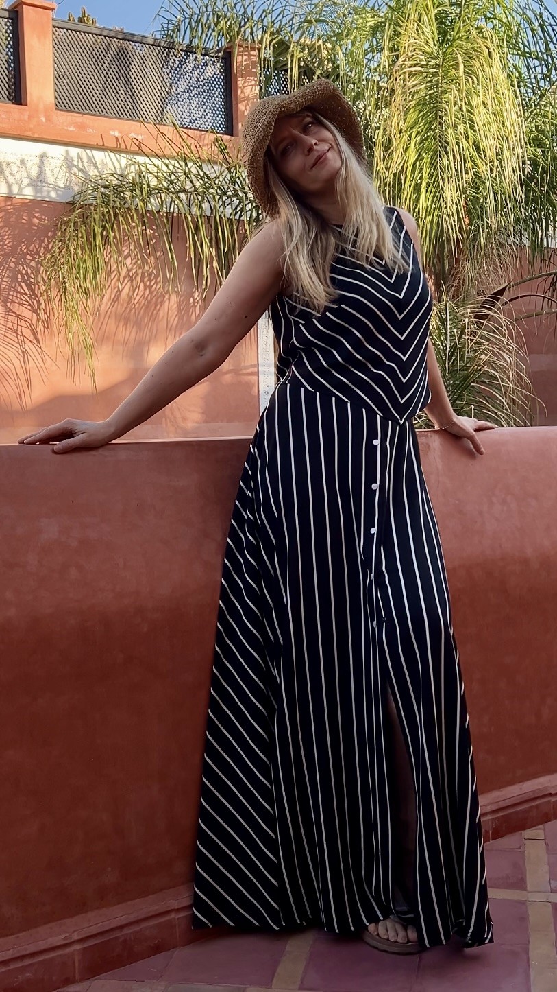Elegancka i niezwykle kobieca długa spódnica wykonana w 100% z lekkiej, oddychającej wiskozy. Czarna baza przełamana subtelnymi beżowymi paseczkami nadaje jej ponadczasowego charakteru i sprawia, że świetnie sprawdzi się zarówno w codziennych stylizacjach, jak i na bardziej wyjątkowe okazje.
