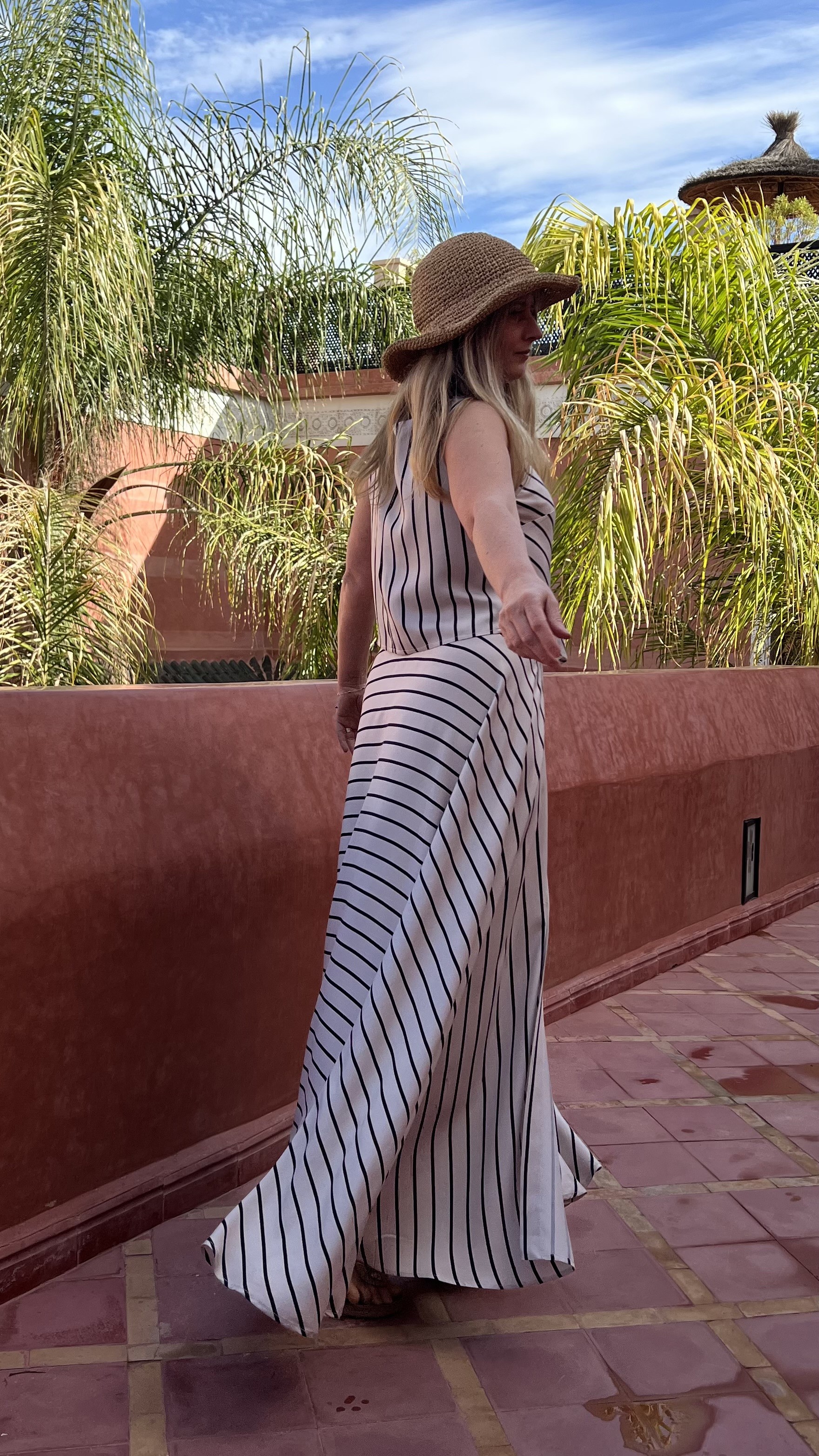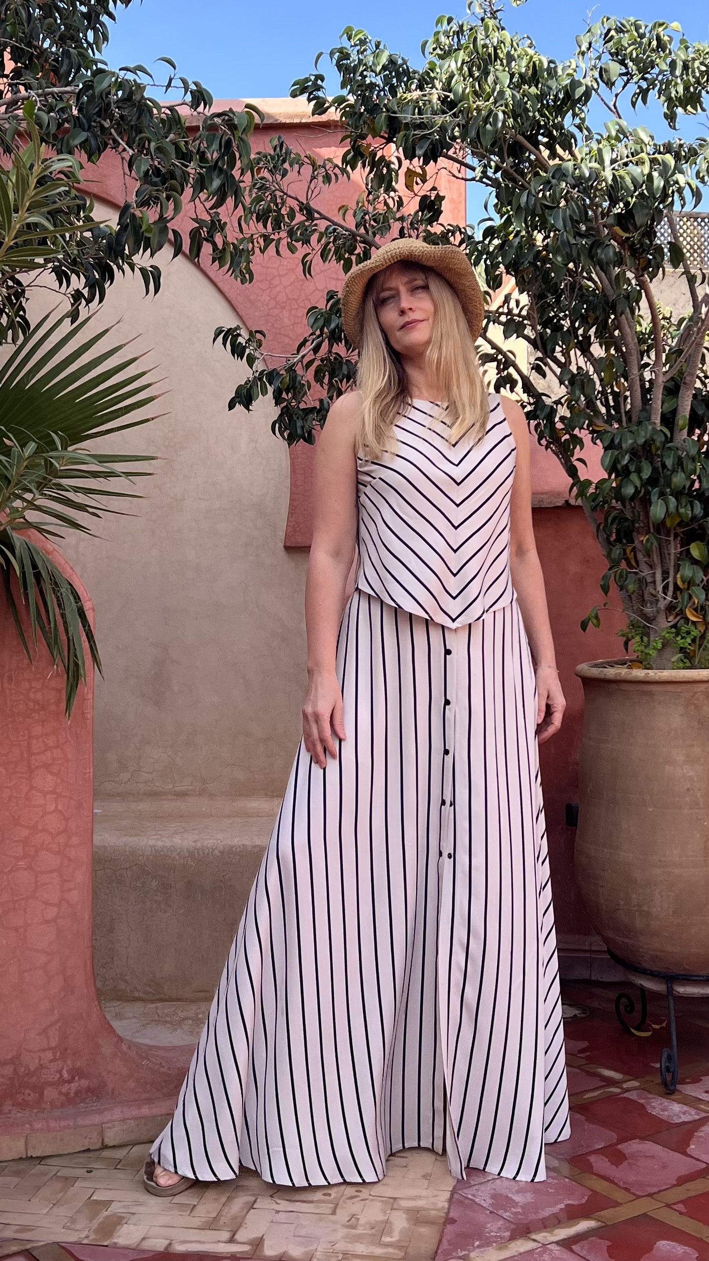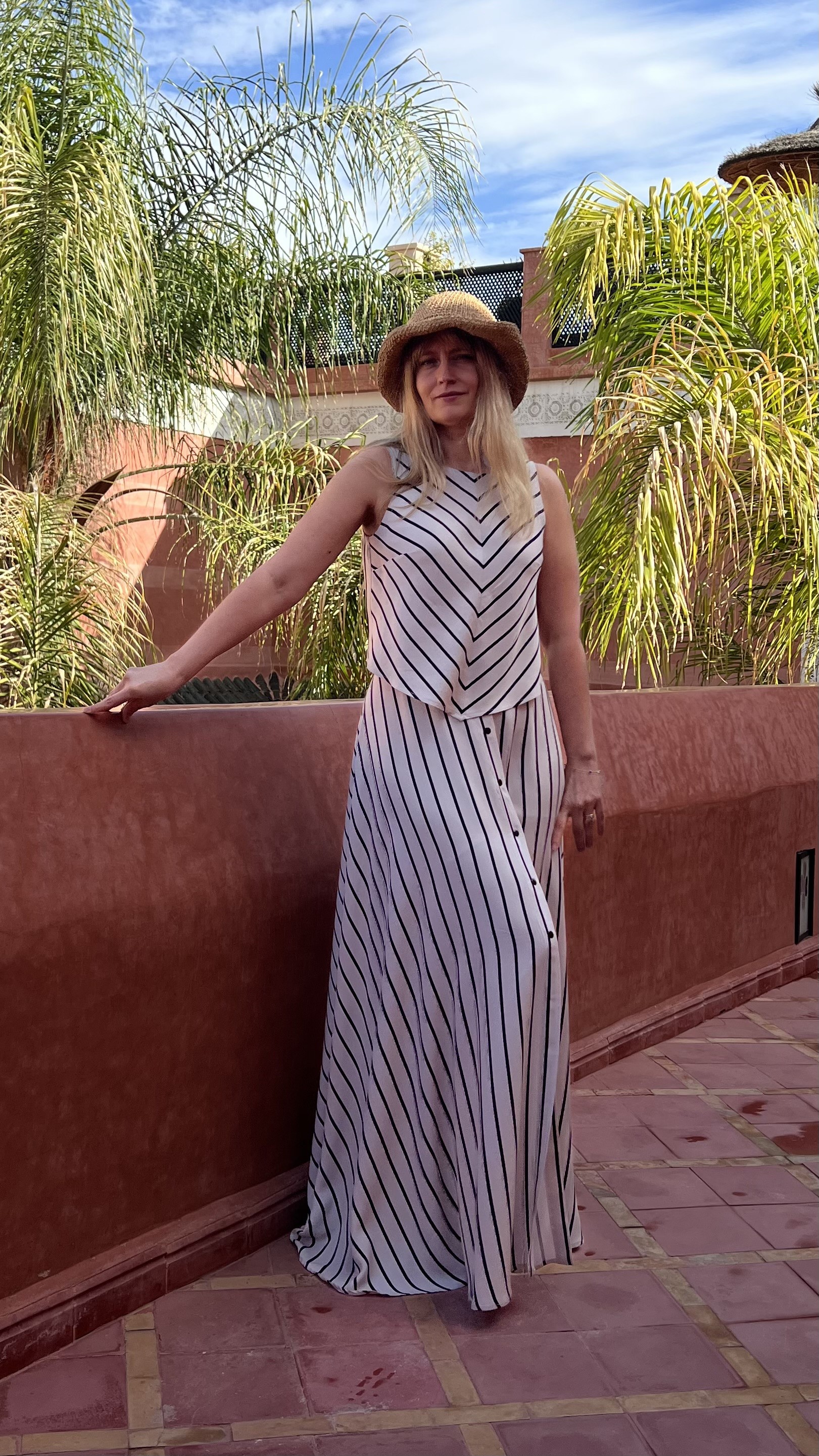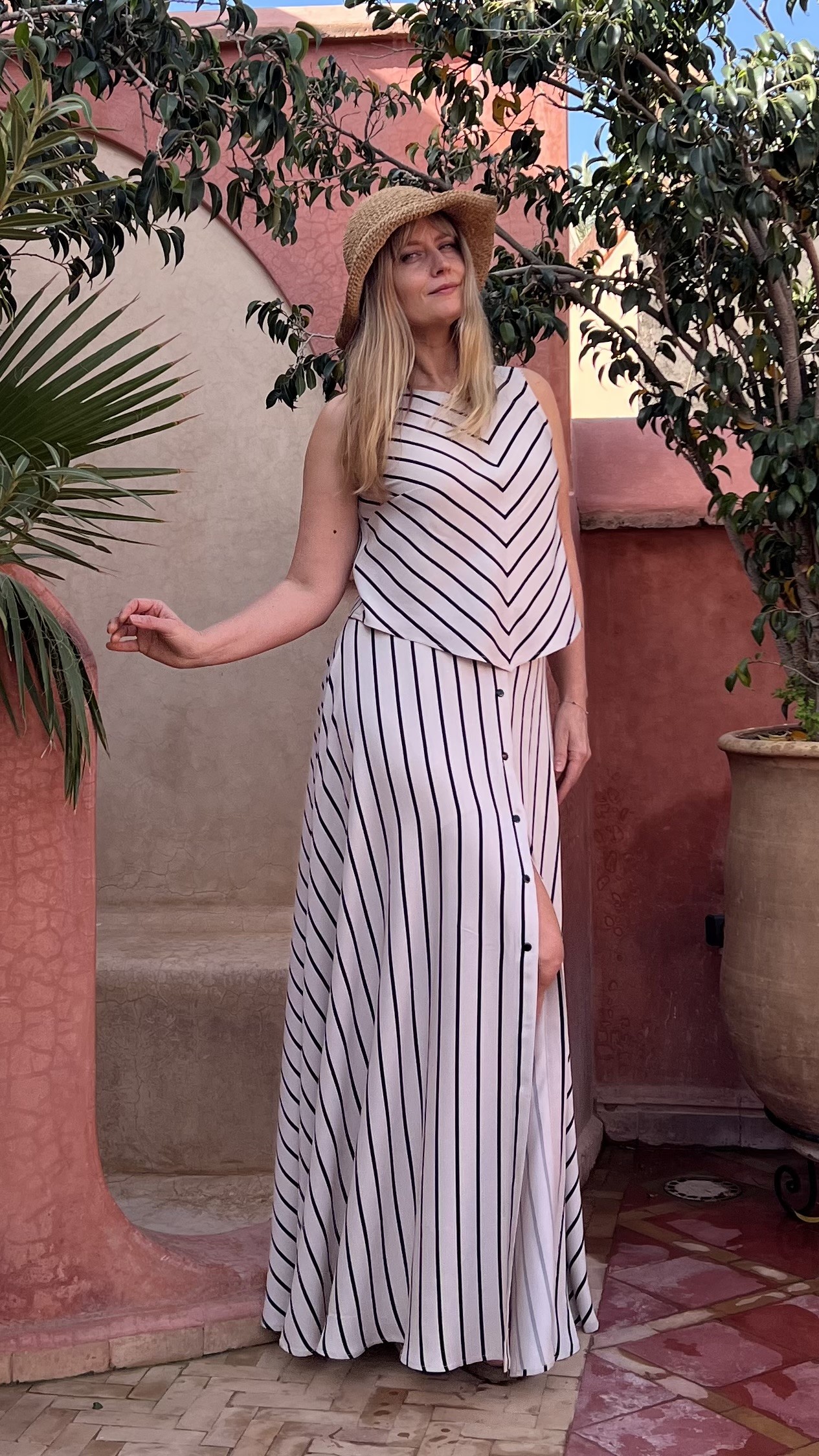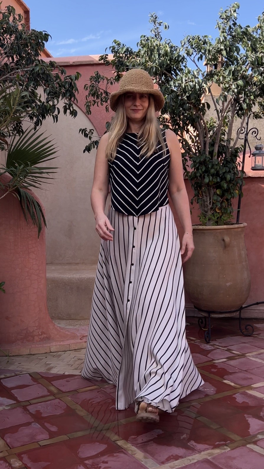 Elegancka i niezwykle kobieca długa spódnica wykonana w 100% z lekkiej, oddychającej wiskozy. Beżowa baza przełamana subtelnymi czarnymi paseczkami nadaje jej ponadczasowego charakteru i sprawia, że świetnie sprawdzi się zarówno w codziennych stylizacjach, jak i na bardziej wyjątkowe okazje.