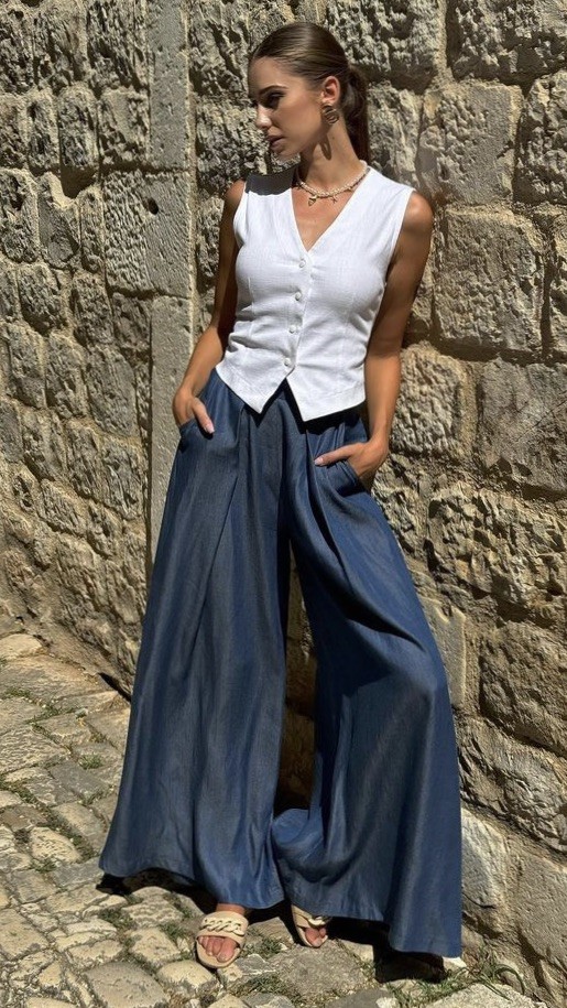 Wszystko to sprawia że spodnie są szalenie efektowne mimo braku druku. W naszej stylizacji proponujemy je z kamizelką AJSZA- biel optyczna.