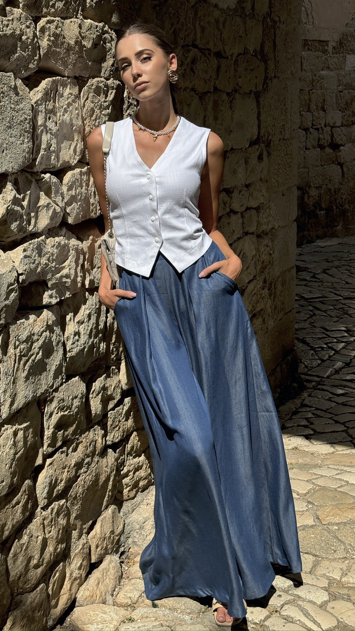 Spódnico- spodnie JEANS to towar luksusowy za sprawą jakości surowca. Do produkcji tych spodni użyliśmy szlachetnej tkaniny 100% tencel- włokno powstałe z drewna eukaliptusowego. Ta niewzwykła tkanina charakteryzuje się wysoką przewiewnością. Co ciekawe, działa ona podobnie jak wełna. Ta bowiem w upalne dni chroni przed przegrzaniem organizmu, a w chłodne przed jego wychłodzeniem. To zasługa świetnej cyrkulacji powietrza i zdolności tencelu do odprowadzania wilgoci ze skóry. Mimo że użyta tkanina jest cieniutka, jest to jeans i tak też się zachowuje w użytkowaniu. Może wycierać się podczas prania, jeśli chcesz uniknąć wyraźnych przetarć kategorycznie nie susz ich w suszarce!!! Zalecamy jak wszystkie nasze ubrania z tkanin naturalnych pranie ręcznie.